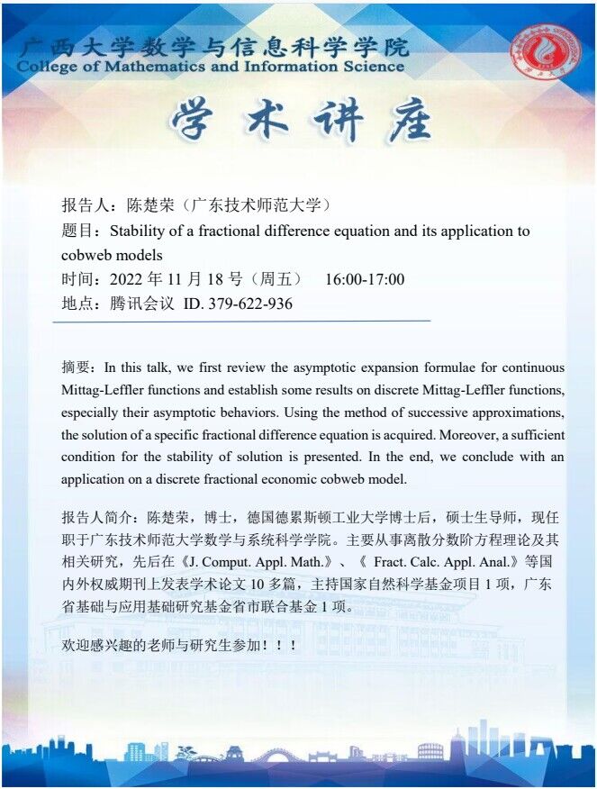 学术讲座:Stability of a fractional difference equation and its application to cobweb models