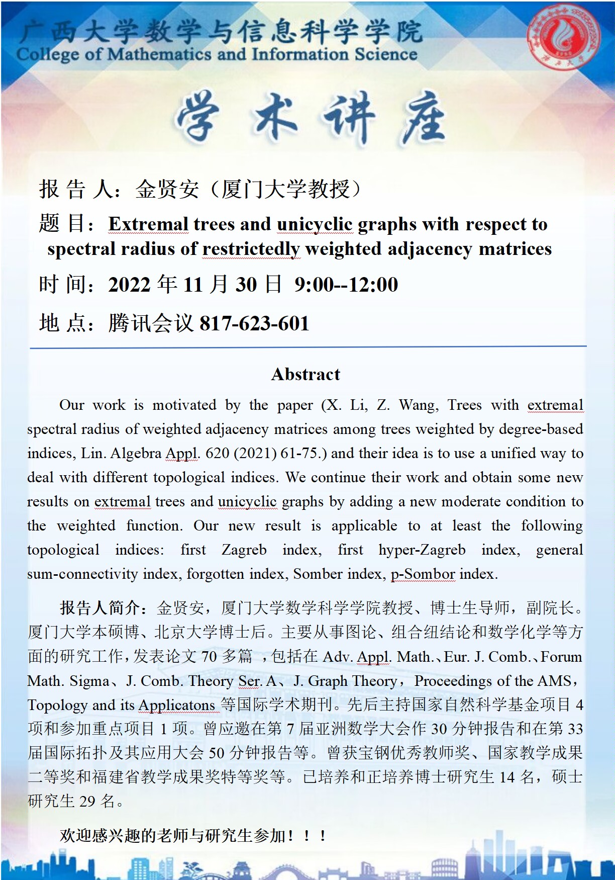 学术讲座:Extremal trees and unicyclic graphs with respect to spectral radius of restrictedly weighted adjacency matrices