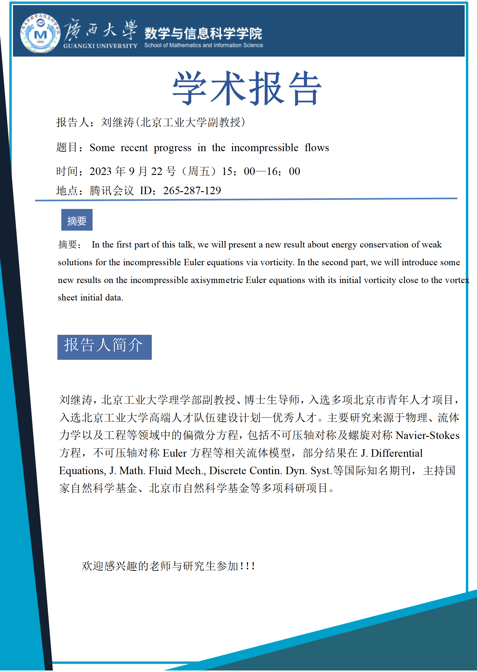 学术报告: Some recent progress in the incompressible flows
