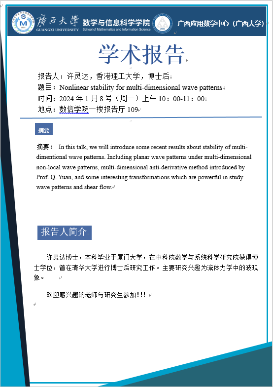 学术报告:Nonlinear stability for multi-dimensional wave patterns