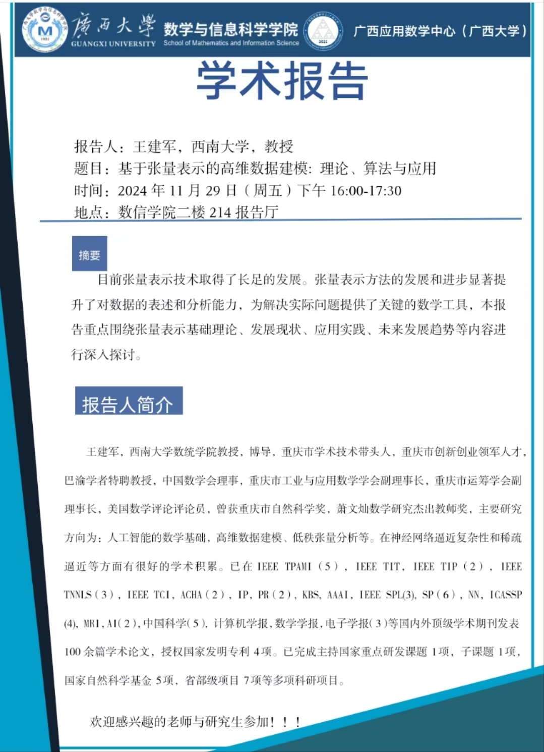 学术报告:基于张量表示的高维数据建模: 理论、算法与应用