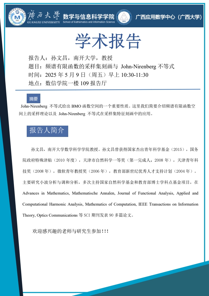 学术报告:频谱有限函数的采样集刻画与 John-Nirenberg不等式
