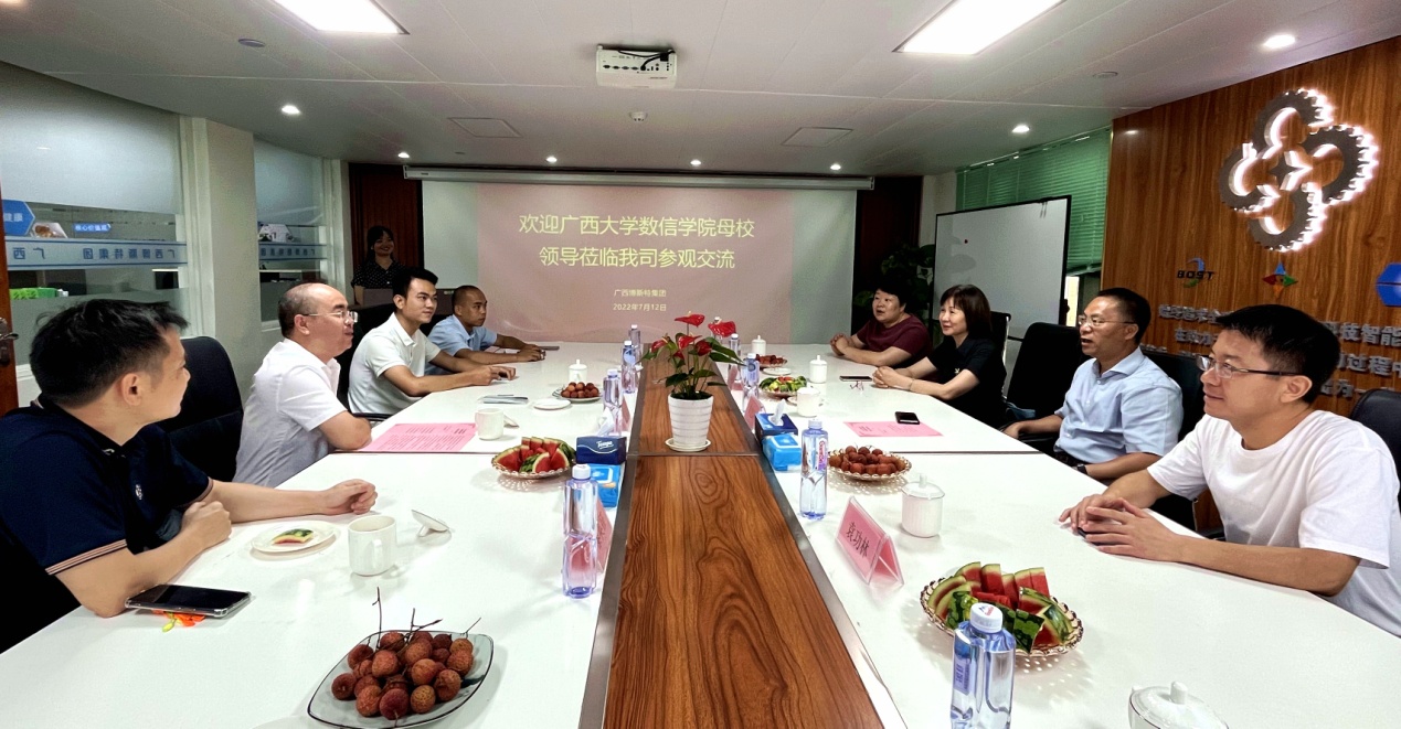 在2022届毕业生就业的最后冲刺阶段,为进一步做好访企拓岗促就业专项行动,深入推进校企合作,搭建校企互助平台,2022年7月12日上午,数信学院党委书记黄建荣、党委副书记郭海燕、副院长袁功林、辅导员周蕾一行前往校友企业广西博斯特集团走访调研,受到集团董事长、亚洲色吧