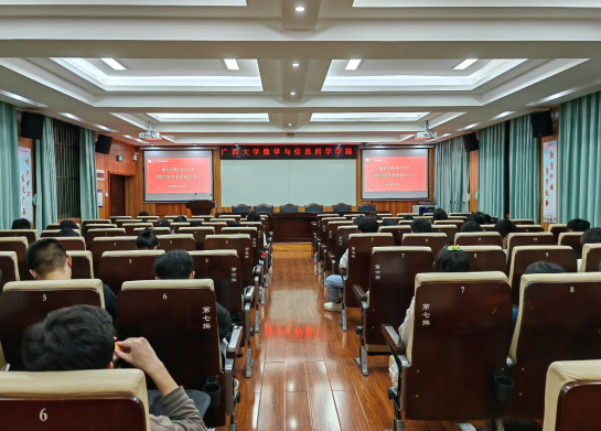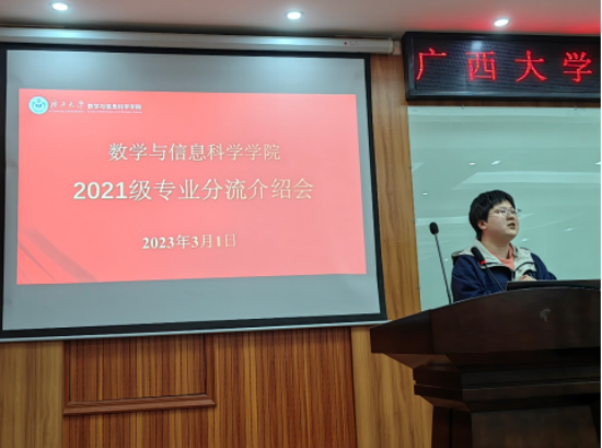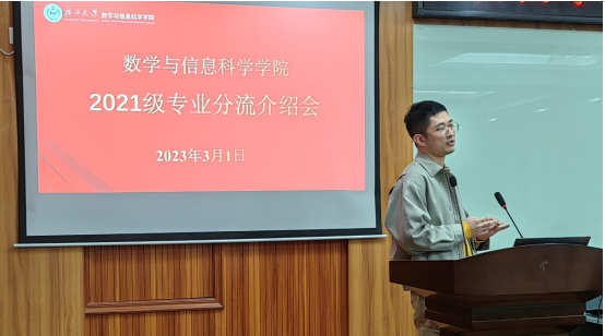 在109报告厅召开了2021届专业分流介绍会,数学与应用数学系主任李靖建教授、信息与计算科学系副主任徐洁琼教授、数学类211班班主任刘楚箫博士、数学类212班班主任张幸博士及2021级数学类全体本科生参加本次分流专业介绍会。