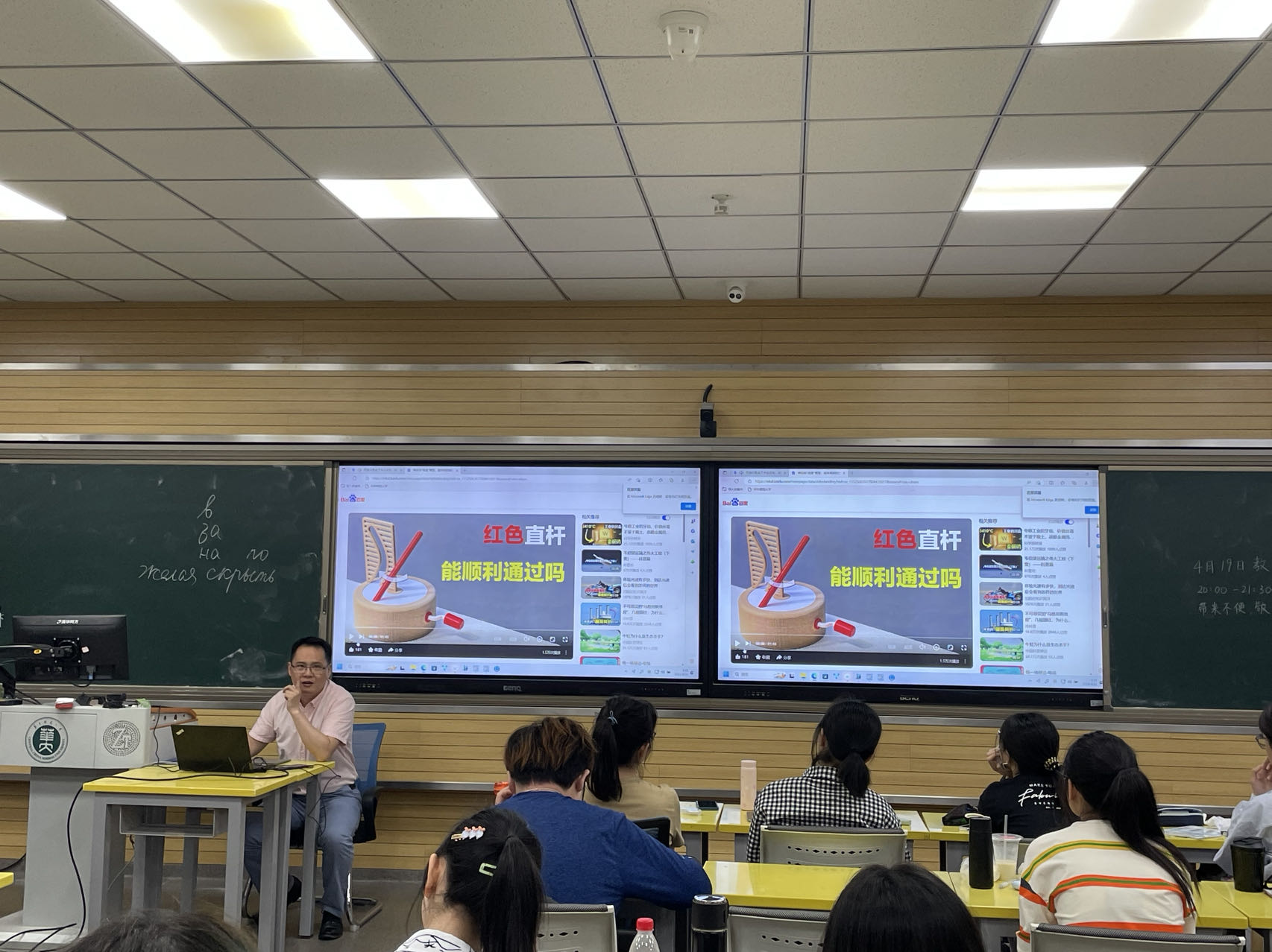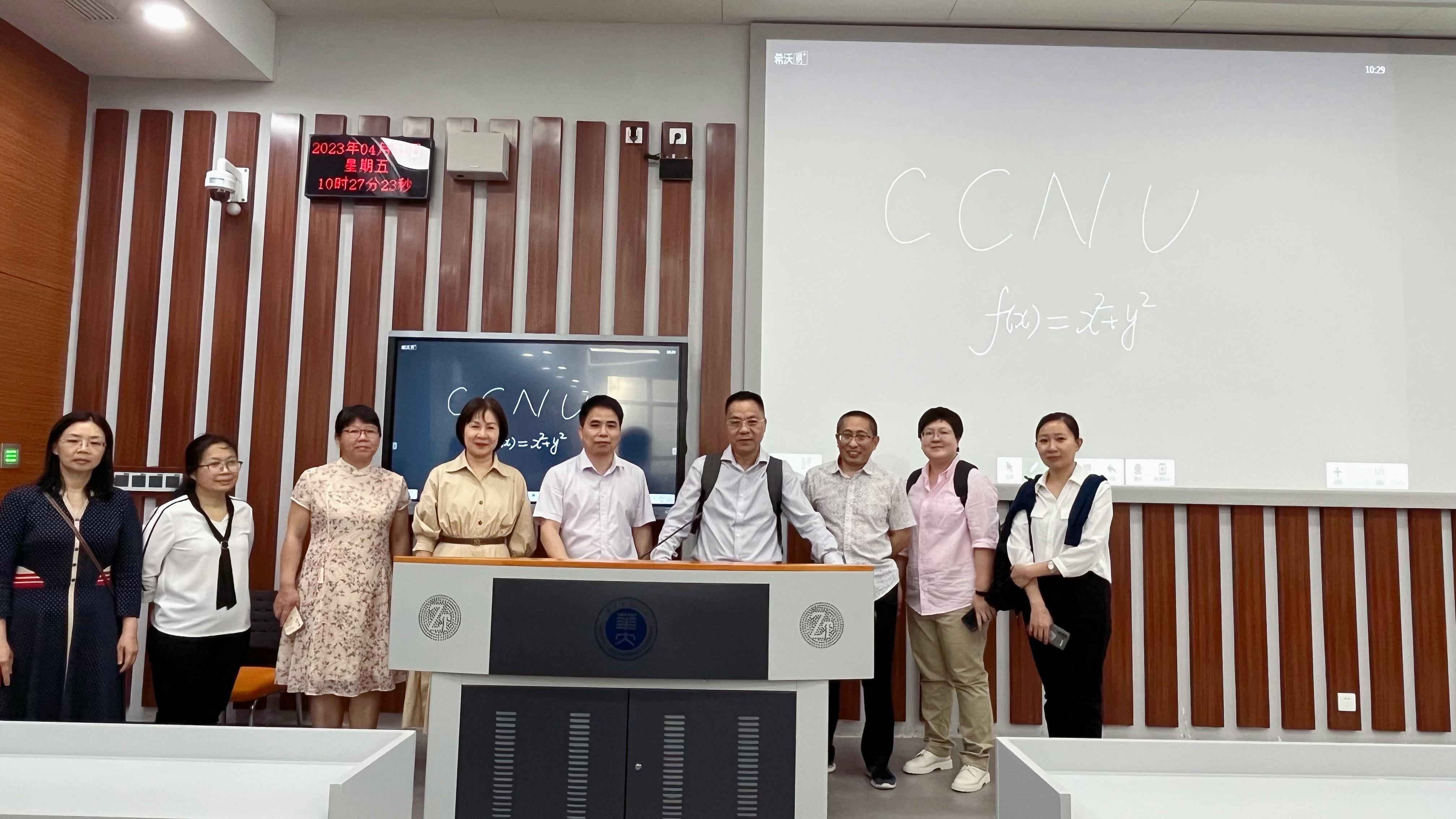 访问期间,调研组一行还集体观摩了华中师范大学智慧教室的授课现场,听取了智慧教室系统教学示范,亲身体验实操与教学组织全过程,并就智慧教室的软硬件系统及多媒体课件使用情况进行了深入的探讨和交流。双方一致同意成立跨校级的智慧教学虚拟教研室,共享教学资源。