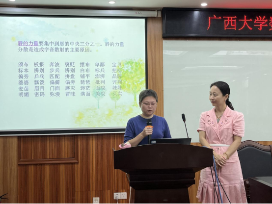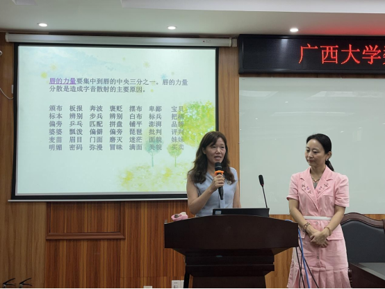 讲座过程中,田昀艳老师通过发音要领示范、邀请老师演示、互动指导发声技巧等方式传授教师发音与讲话等技巧,田昀艳老师的讲座既专业又风趣,教职工掌声笑声不断,气氛活跃,教职工纷纷表示受益匪浅。