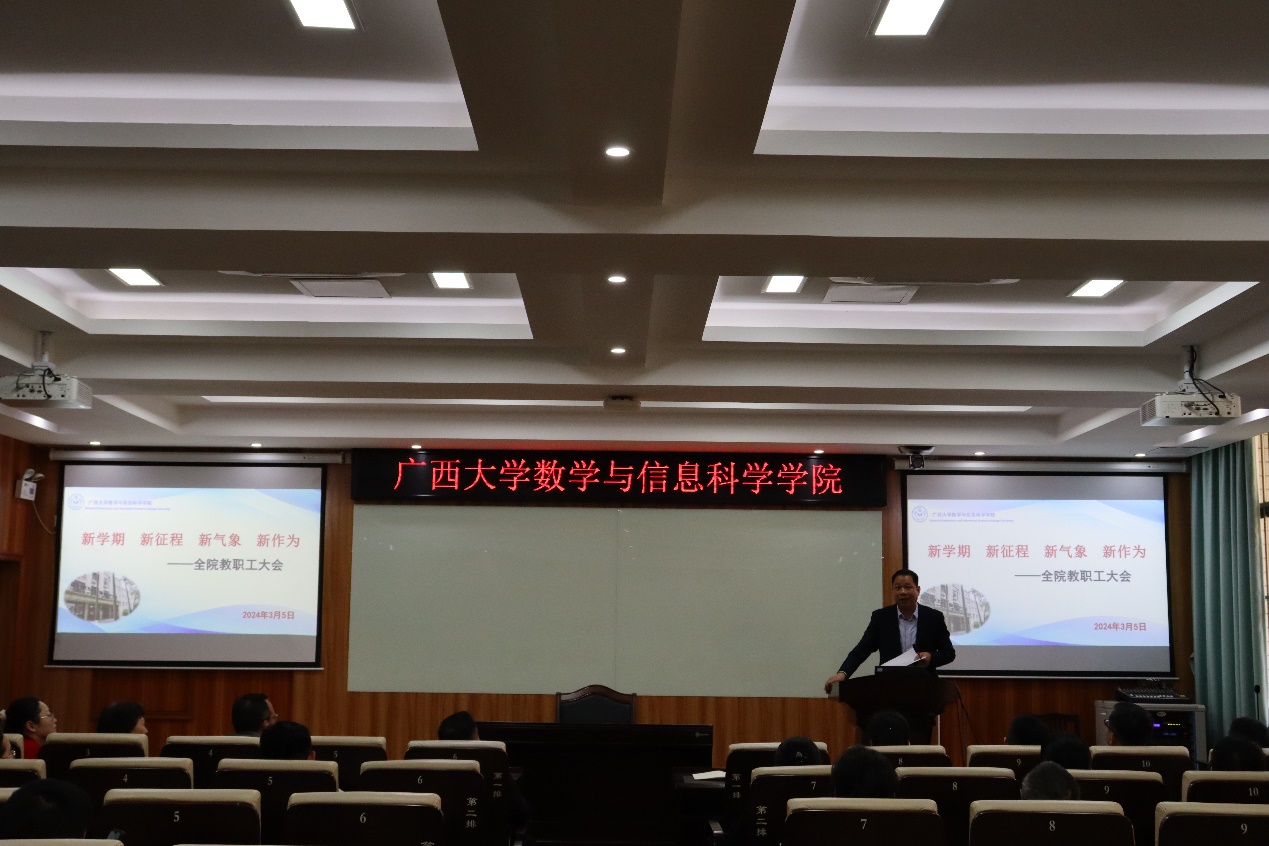 召开了以“新学期、新征程、新气象、新作为”为主题的全体教职工大会,会议全面总结回顾了一年来各项工作的开展情况、取得的成绩,并为新学期工作指明了方向、鼓足了干劲。学院全体教职工参加了会议,会议由院党委书记覃宪儒主持。
