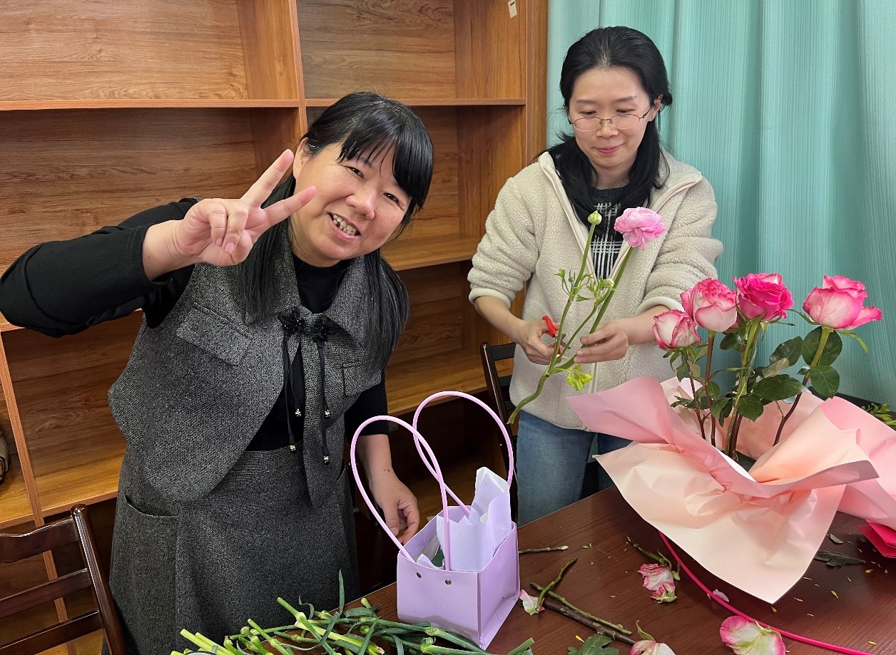 李林教授在花艺基础知识讲座中,从花材种类、颜色搭配、造型原理、作品鉴赏以及插花创作等方面为老师们科普鲜花花语和插花技巧,并现场展示经典插花造型。女教工们在老师的悉心指导下,大胆发挥自身想象力,根据手中的花材特点、颜色,创意修剪、搭配,每个人脸上都洋溢着幸福快乐的笑容,在轻松愉快的氛围中感受插花艺术的魅力,一束束错落有致、创意十足的“私人定制”花艺作品在老师们手中被赋予了新的芬芳。