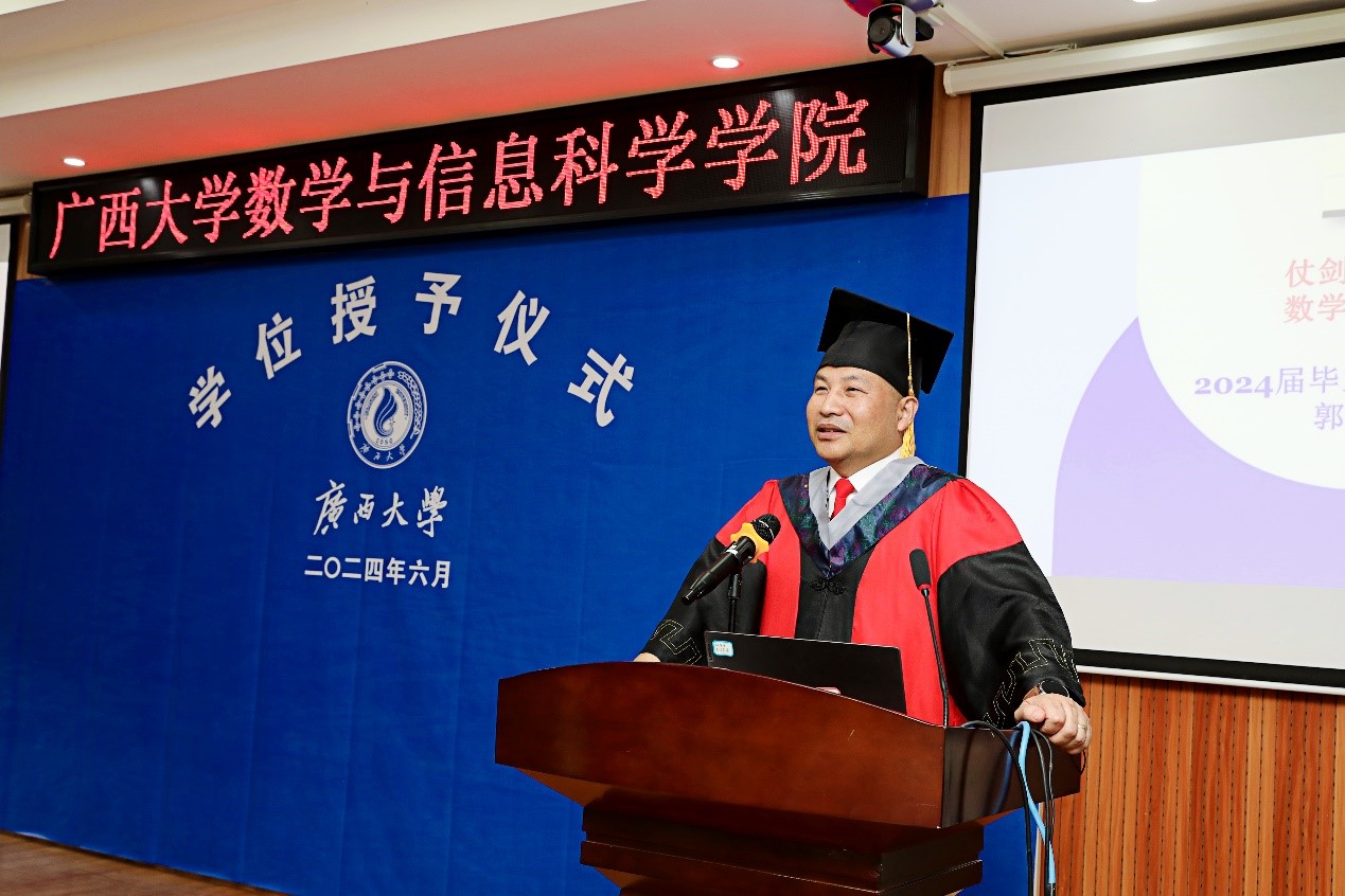 院长郭真华为2024届全体毕业生颁发学位证书并实施拨穗礼。礼成之后,郭真华为获得2024年学院优秀毕业生荣誉称号(首次评选)的同学们颁发荣誉证书并讲话。他回顾了近年来学院的学科建设取得的优异成绩,细数了与同学们在教学、生活中相处的点滴回忆。他强调,同学们要学会把数学思维作为数学人的立足之本,用追求真理、脚踏实地、拥抱初心、乐观豁达的行世态度经营自己的数学人生,为人做事务必心中有数。最后,他寄语全体毕业生,希望同学们关注母校发展,保持师生联系,积极寻求合作,做一个对社会有用的人,对国家的发展建设有作为的人,欢迎常回家看看!