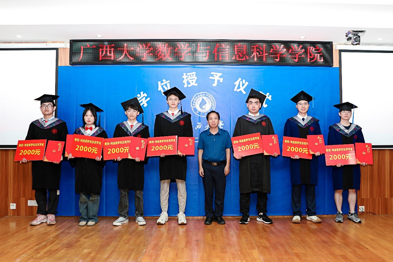 第一届“数信·鸿途逐梦”校友奖学金的毕业生们颁奖并与获奖同学合影留念。在颁奖仪式后的讲话中,连建耀结合自己的创业经历和成功经验,给即将步入社会的大学生就如何尽快适应职场需要进行了指导。