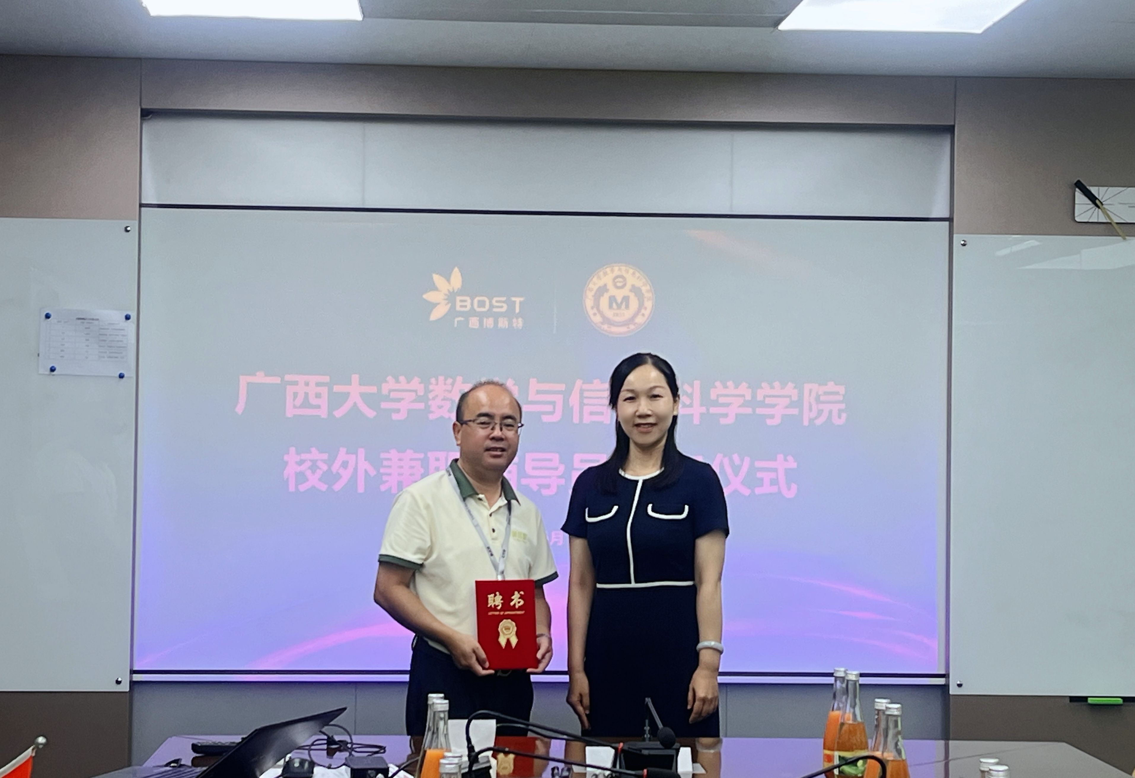 校外兼职辅导员聘任仪式,吴华丽为张誉颁发聘书,聘任其为亚洲色吧