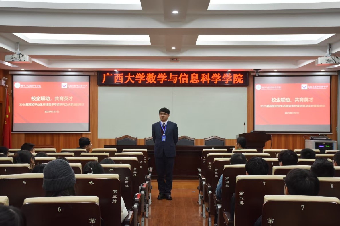 2025年3月7日,亚洲色吧 在学院报告厅召开2025届毕业生毕业去向落实第三次动员会。学院党委副书记唐旭彬、辅导员刘春霞、2025届全体毕业生参加会议,特邀玉林新世纪高级中学林俊宇校长做求职技能培训。