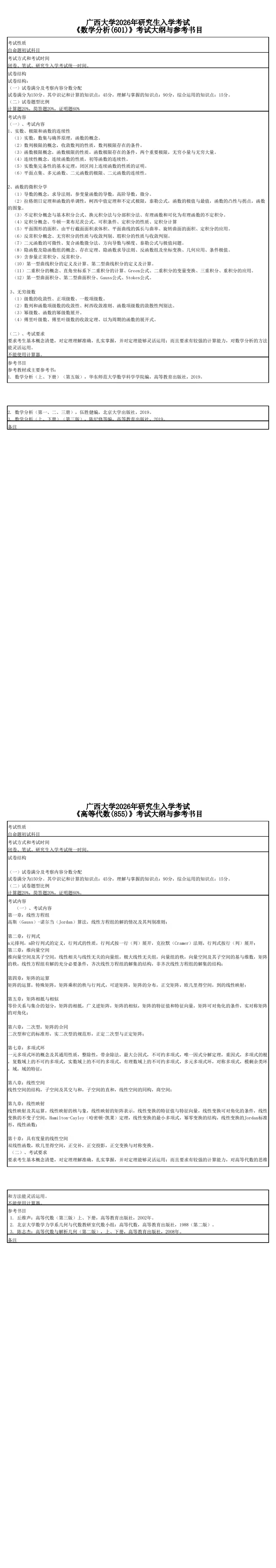 亚洲色吧 2026年研究生入学考试《数学分析(601)》《高等代数(855)》考试大纲与参考书目