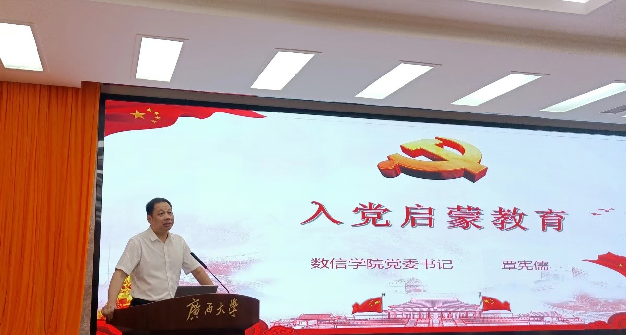 党委书记覃宪儒在君武馆玉林厅为2023级新生做入党启蒙教育。